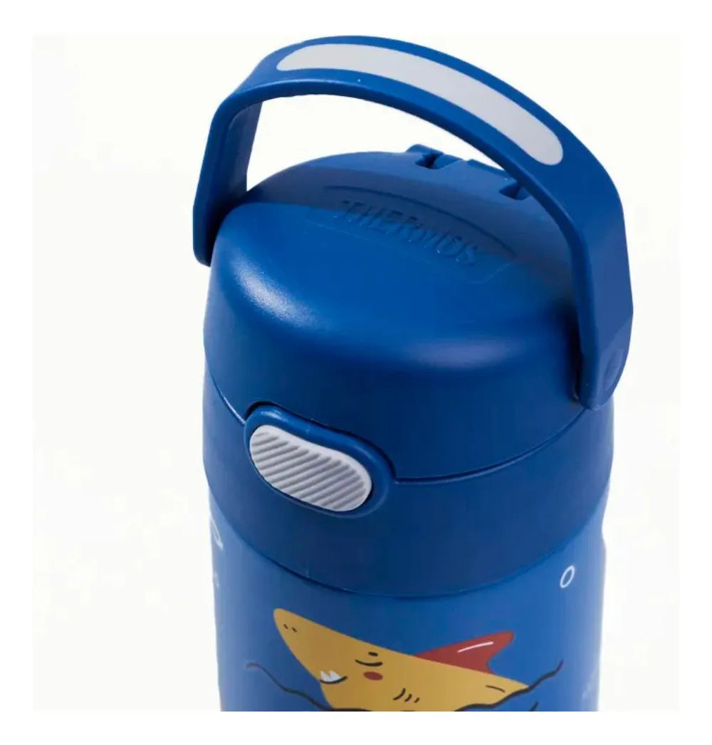 A Garrafa Térmica Infantil Thermos Funtainer F410 com estampa de Tubarão 355ml é a escolha ideal para manter as crianças hidratadas de forma prática e divertida. Com isolamento a vácuo, essa garrafa mantém a temperatura de sucos, água e outras bebidas frescas por até 12 horas, oferecendo aos pais a confiança de um produto durável e seguro, desenvolvido pela marca líder em térmicos infantis. Projetada para mãos pequenas, a Thermos Funtainer F410 permite que a criança abra e feche com facilidade usando apenas uma mão, graças ao seu sistema de abertura intuitivo, ergonômico e higiênico, já que a tampa permanece fechada após o uso, sem contato com o ambiente. O canudo de silicone macio proporciona um toque suave ao beber, enquanto a alça externa integrada facilita o transporte, perfeita para a escola, passeios e atividades ao ar livre.
